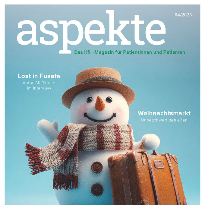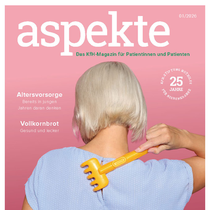 Eine abwechslungsreiche Mischung von Berichten aus den Themenblöcken Gesundheit, Dialyse, Leben – das zeichnet das KfH-Magazin aspekte für Patientinnen und Patienten aus. Es erscheint mit einer Auflage von rund 20.000 Exemplaren viermal im Jahr. Die aktuellen Ausgaben stehen hier für Sie zum Download bereit und liegen in den KfH-Zentren aus.